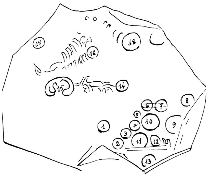 Die vielfältigen und ganz unterschiedlichen Bildzeichen dieser Felsbildstation sind in rund 20 Felsbildtafeln unterteilt worden. Wobei sich im Zentrum der Hauptseite der Basaltsteinwand die auffälligsten Gravuren befinden, von denen in diesem Blog exemplarisch die Bedeutung von fünf Symbolen ansatzweise kurz erläutert wird. Im Anschluss daran sind die Untersuchungsergebnisse in einem eigenen Artikel zusammengefasst worden, um die Landkartentheorie verständlich zu machen: Frühester Meister der Kartographie.
